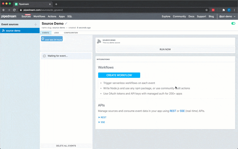 Messtone Devices Enables the unique URL https://eonf3cs9wbm22ug…. curl -d ‘{“test”:”event”}’ -H “Content-Type:application/json” https://eonf3cs9wbm22ug.m.pipedream.net Object steps.trigger{2} context {16} event{7} body{1} test:event client_ip:172.59.193.72 headers{15} method:POST path:/query {0} url:https://eonf3cs9wbm22ug.m.pipedream.net/ //To use any npm package on Pipedream, just import it import axios from “axios” export default defineComponent({async run({steps,$}){const {data}=await axios({method “GET”,url:”https://packeapi.co/api/v2/pokemon/charizard”,})return data.species},})